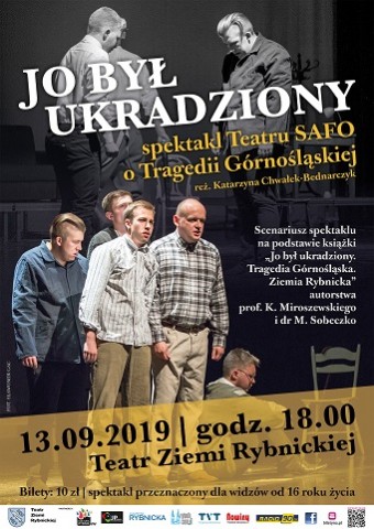 13.09.2019 o godz. 18.00 zapraszamy na spektakl "Jo był ukradziony" w wykonaniu Teatru SAFO. Mimo upływu lat na Górnym Śląsku istnieje nadal wiele ważnych i nieopowiedzianych historii. Tragedia Górnośląska jest jedną z nich. Dlatego powstała ta sztuka. Scenariusz spektaklu powstał w oparciu o relacje świadków, osób deportowanych i ich rodzin, jak również pozyskanych dokumentów archiwalnych zawartych w publikacji pod tym samym tytułem. Inicjatorem powstania publikacji i spektaklu jest Stowarzyszenie MOJE MIASTO z Rydułtów. Spektakl przeznaczony dla widzów od 16 roku życia. Bilety: 10 zł KUP BILET
