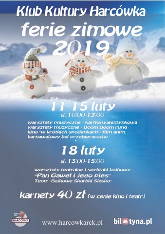 Zapraszamy dzieci do wspólnych zabaw w ramach ferii zimowych - "Ferie 2019 w Harcówce". Od 11 do 15 lutego, codziennie w godz.: 10.00-13.00 proponujemy: