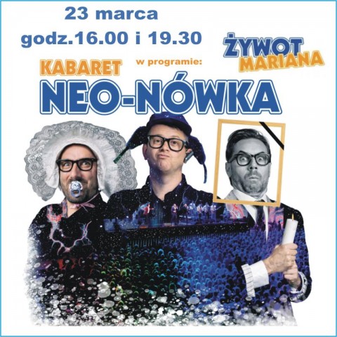 23.03. o godz. 16.00 i 19.30 zapraszamy na „Żywot Mariana” - najnowsze dzieło Kabaretu Neo-Nówka. Po sukcesie programu „Kazik Sam w domu” Neo-Nówka kontynuuje podróż w głąb duszy Polaka. „Żywot Mariana” to kabaretowy spektakl pokazujący losy statystycznego Mariana od narodzin, aż po jego kres. Jeżeli zastanawiasz się jak żyć, to ten program jest dla Ciebie, natomiast jeżeli nie zastanawiasz się jak żyć, to ten program jest dla Ciebie. Bilety: 80 zł balkon, 90 zł parter II miejsca, 100 zł parter I miejsca KUP BILET na godz. 16.00 | KUP BILET na godz. 19.30