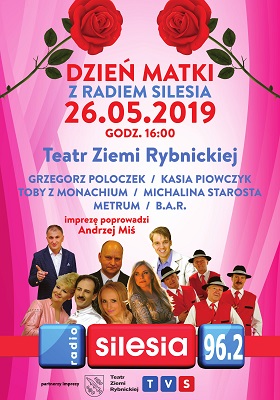 26.05. o godz. 16.00 zapraszamy na niezwykły koncert. Kocham Cię Mamo ... nie wstydźmy się tych słów. Z okazji wyjątkowego święta - Dnia Matki - Radio Silesia zaprasza na niepowtarzalny koncert. Na scenie Teatru Ziemi Rybnickiej wystąpią największe gwiazdy śląskiej sceny muzycznej: Toby z Monachium, Grzegorz Poloczek, Katarzyna Piowczyk, Michalina Starosta, Grupa Metrum Reni & Marco oraz Zespół B.A.R. Imprezę poprowadzi Andrzej Miś, a zatem dobrego humoru, kabaretu i żartu nie zabraknie. Zapraszamy serdecznie i zachęcamy do sprawienia- każdej z Mam - wyjątkowego i niezapomnianego prezentu. Bilety: 55 zł balkon, 60 zł parter (w przedsprzedaży do 30.04. | 65 zł balkon, 70 zł parter (od 1.05). KUP BILET Organizatorem koncertu jest Radio Silesia