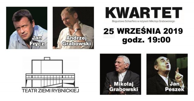 25.09. o godz. 19.00 zapraszamy na kultowy spektakl Bogusława Schaeffera "Kwartet". Historia czterech artystów poszukujących sensu życia, teatru i sztuki jako takiej. Wybitne aktorstwo, atmosfera „półprywatności", zmienność konwencji, zaskakujące widza niespodzianki – to wszystko składa się na oryginalne i dowcipne widowisko, które co wieczór zachwyca swoją niepowtarzalnością. Zapraszamy zarówno miłośników teatru, jak i muzyki! Obsada wymienna: Andrzej Grabowski, Jan Peszek, Mikołaj Grabowski, Bogdan Słomiński. BILETY: 80 i 70 zł - do 31.08 I 90 i 80 zl - od 01.09. KUP BILET