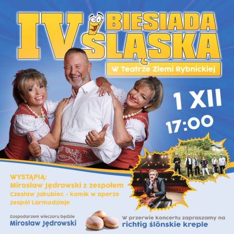 1.12. o godz. 17.00 zapraszamy na IV Biesiadę Śląską. Wystąpią: Mirosław Jędrowski z zespołem, Czesław Jakubiec - komik w operze i zespół Larmodzieje. Gospodarzem wieczoru będzie Mirosław Jędrowski, a przerwie koncertu zapraszamy na richtig ślōnskie kreple. Bilety: 50 zł do 30.11. | 60 zł w dniu koncertu KUP BILET