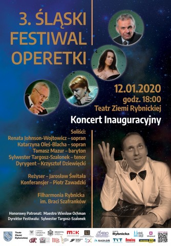 12.01.2020, o godz. 18.00 zapraszamy na koncert inauguracyjny III Śląskiego Festiwalu Operetki. Wystąpią soliści: Renata Johnson–Wojtowicz - sopran, Katarzyna Oleś–Blacha - sopran, Tomasz Mazur - baryton, Sylwester Targosz–Szalonek - tenor oraz Filharmonia Rybnicka im. Braci Szafranków pod dyrekcją Krzysztofa Dziewięckiego. Konferansjer - Piotr Zawadzki. Reżyseria - Jarosław Świtała. Bilety: 70 zł w przedsprzedaży do 31.12.| 90 zł od 1.01.2020 r. KUP BILET