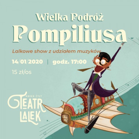 14.01.2020, o godz. 17.00, zapraszamy dzieci z rodzicami na "Wielką Podróż Pompiliusa”, spektakl dla dzieci z muzyką na żywo w wykonaniu Teatru Lalek Marka Żyły! Cóż to takiego, ten „Pompilius”? Czy jakiś egzotyczny ptak? Może owoc? A może łaciński filozof? Nic z tych rzeczy! Pompilius to najnowszy wynalazek genialnego naukowca i podróżnika. Cudowna maszyna jest napędzana najbardziej ekologicznym paliwem świata - dobrą muzyką! Pompilius zabierze wszystkich widzów w szaloną podróż na księżyc i pod powierzchnię ziemi, oraz na podbój podmorskich krain i tajemniczych wysp. To będzie niezapomniana przygoda okraszona charakterystycznym dla Marka Żyły humorem i świetną muzyką na żywo. Prawdziwa gratka i dla najmłodszych i dla tych odrobinę starszych poszukiwaczy dobrej zabawy! Bilety 15 zł KUP BILET