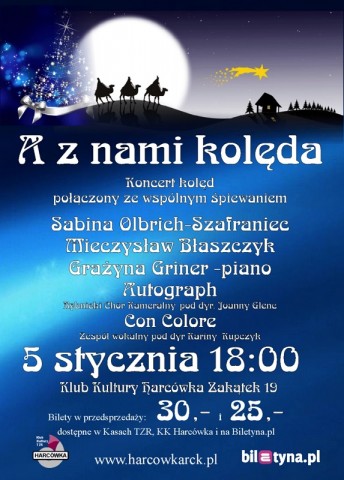 5.01. godz. 18.00, Klub Kultury "Harcówka" zaprasza na koncert „A z nami kolęda” – najpiękniejsze kolędy świata połączone ze wspólnym śpiewaniem. Wykonawcy: Sabina Olbrich-Szafraniec, Mieczysław Błaszczyk, Grażyna Griner, Rybnicki Chór Kameralny „Autograph” pod dyr. Joanny Glenc, Dziecięcy Chór „Con Colore” pod dyr. Kariny Kupczyk. Klub Kultury Harcówka, 44-203 Rybnik, ul. Zakątek 19. Bilety: w przedsprzedaży do 4.01.2020 – 30 i 25 zł ulgowe | w dniu koncertu: 35 i 30 zł ulgowe.