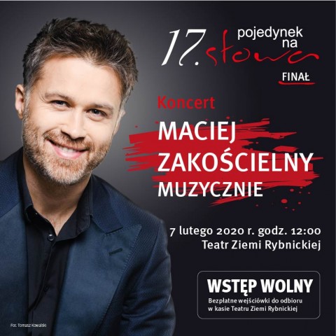 Wstęp na Finał 17.Pojedynku na Słowa i koncert Macieja Zakościelnego jest wolny, a bezpłatne wejściówki można odebrać w kasie Teatru Ziemi Rybnickiej. Głównym organizatorem „Pojedynku na Słowa” jest Fundacja PGE Energia Ciepła, współorganizatorami Dom Kultury w Rybniku-Chwałowicach oraz Teatr Ziemi Rybnickiej. Honorowy patronat nad wydarzeniem objął Piotr Kuczera, Prezydent Miasta Rybnika.
