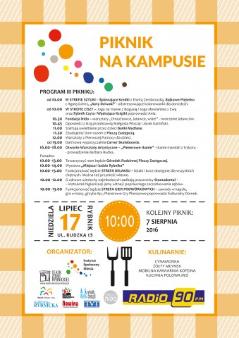 W niedzielę 17 lipca od 10.00 zapraszamy na III Piknik na kampusie. W programie gry i zabawy dla dzieci, tworzenie latawców, czytanie książek, joga, opowieści o Rybniku, bańki mydlane. Ponadto warsztaty z udzielania pierwszej pomocy i darmowa wypożyczalnia Carver Skateboard.
