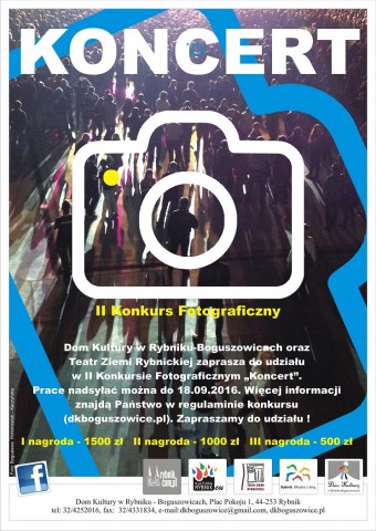 Dom Kultury w Rybniku-Boguszowicach www.dkboguszowice.pl wspólnie z Teatrem Ziemi Rybnickiej www.teatrziemirybnickiej.pl zapraszają wszystkich fotografujących do udziału w II Konkursie Fotograficznym „KONCERT”.