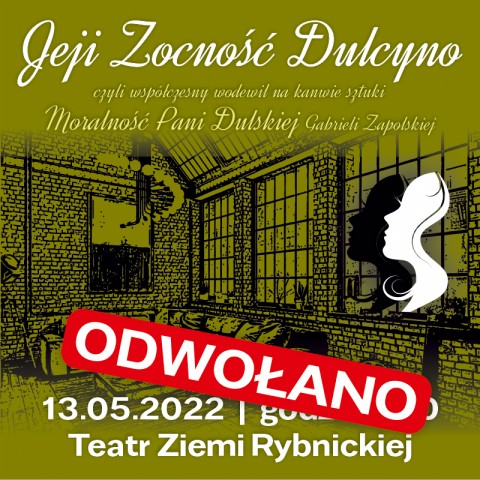 Planowany na piątek, 13 maja o godz.19.00 spektakl "Jeji zocność Dulcyno" w Teatrze Ziemi Rybnickiej, został odwołany z powodu niskiej frekwencji. Bilety podlegają zwrotowi w miejscu zakupu. Przepraszamy.