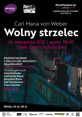 24.11.2021, godz.18.00. Opera & Balet w Kinie: Carl Maria von Weber „Wolny strzelec”. Spektakl z okazji 200. rocznicy prapremiery i 200. rocznicy istnienia Konzerthaus Berlin. W rolach głównych: Anna Prohaska, Benjamin Bruns, Falk Struckmann, Franz Hawlata, Viktor Rud. Cena biletu: 24 zł, w dniu projekcji 29 zł. KUP BILET