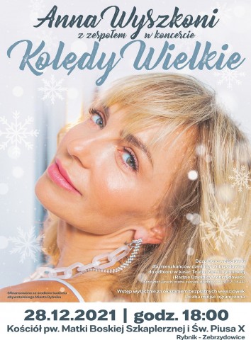 Na okres świąteczny przygotowaliśmy propozycję niezwykłego koncertu Anny Wyszkoni, który oddaje magię świąt Bożego Narodzenia. 28.12.2021 o godz. 18.00 zapraszamy do kościoła w Rybniku-Zebrzydowicach na koncert Anny Wyszkoni "Kolędy Wielkie". Wstęp bezpłatny wyłącznie za okazaniem wejściówek. Prosimy o zapoznanie się z regulaminem koncertu zamieszczonym poniżej*.
