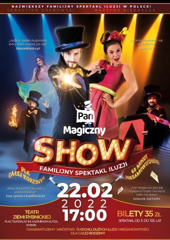 22.02.2022 o godz. 17.00 zapraszamy na Pan Magiczny Show – pokaz iluzji dla całej rodziny. Pan Magiczny, czyli Sebastian Grabowski - Mistrz Polski w Iluzji Scenicznej .Międzynarodowy artysta, który występował niejednokrotnie na scenach Anglii, Niemiec, Francji, Holandii, a nawet w Wietnamie i Kambodży! Część widzów może go kojarzyć z programu Mam Talent, gdzie dał popis swoich iluzjonistycznych umiejętności. Pan Magiczny Show to spektakl pełen śmiechu, magii i niesamowitości, który angażuje całą publiczność dzięki trikom pokazywanym w takt muzyki. W programie zobaczymy m.in. lewitację stolika, przenikanie ręki przez szybę, czy znikające w dłoni widza piłeczki. Na scenie prócz iluzjonisty zobaczymy również jego asystentkę - Panią Czarującą. Cena biletu: 35 zł. KUP BILET