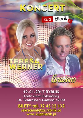 19.01. o godz. 19.00 zapraszamy na wyjątkowy i niepowtarzalny koncert Teresy Werner oraz piosenkarza Graziano, z okazji promocji najnowszej płyty "Miłość to nie zabawa". To wydarzenie muzyczne będzie wspaniałą okazją do wspólnej zabawy przy takich przebojach polskiej artystki jak "Miłość jest piękna", "Kocham swoje morze", "Dałabym Ci dała", jak również międzynarodowych hitach włoskiego gościa: "Mama Leone" czy też "Rot sind die Rosen". Bilety do nabycia w kasie TZR: 80 zł parter, 60 zł balkon oraz na kupbilecik.pl