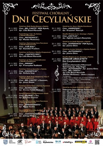 20.11.2022 o godz.19.00. zapraszamy na uroczysty koncert Dni Cecyliańskich 2022 w rybnickiej bazylice św.Antoniego, ul. Mikołowska 4. Wystąpią: Orkiestra kameralna Filharmonii Rybnickiej pod dyrekcją Filipa Hugeta, Chór Autograph pod dyr. prof. Joanny Glenc, Chór Bel Canto pod dyr. Lidii Blazel-Marszolik, Wacław Mickiewicz - słowo o muzyce. W programie: E.Grieg Suita w dawnym stylu "Z czasów Holberga", J.Glenc Lux Aeterna na orkiestrę smyczkową (prawykonanie) oraz utwory a capella J.Glenca, F.Nowowiejskiego, G.Younga, H. Brighta, J.Busto. Wstęp wolny