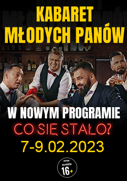7, 8 i 9.02.2023 roku o godzinie 17.30 i 20.30 zapraszamy na najnowszy program Kabaretu Młodych Panów – „Co się stało?”. Jest to sceniczna i oczywiście ironiczna odpowiedź na pytanie, na które większość z nas odpowiada – nic. Czasami lekko rozwijamy odpowiedź, która automatycznie przechodzi w pytanie – nic, dlaczego pytasz? Przecież jeżeli ktoś pyta, to kultura osobista nakazuje nam odpowiedzieć. Jeżeli ktoś docieka i jest żywo przejęty, a nawet gotowy podać receptę lub służyć pomocą, to należy udzielić konkretnej, rozwiniętej odpowiedzi, gdyż już w samym pytaniu Co się stało? słychać i widać, że coś się stało! Nie bójmy się rozmawiać, nie lękajmy się otwierać przed drugim człowiekiem i przede wszystkim nie udawajmy na co dzień, tylko bądźmy sobą!! Program dla widzów 16+ Bilety: od 85 zł. do nabycia na stronie organizatora: https://starmanager.pl/