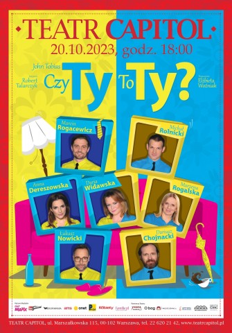 20.10.2023, godz. 18.00. "Czy ty to Ty?". Spektakl komediowy Teatru Capitol w reżyserii Roberta Talarczyka. Nieoczekiwana zmiana miejsc, czyli w pogoni za szczęściem! Współczesne, wielkomiejskie osiedle. Harold wraca po pracy do domu. Zajęta przygotowaniem rodzinnego obiadu Honey, prowadzi z nim rutynową, popołudniową rozmowę. Dzień jak co dzień. Żadne z nich nie dostrzega nawet, że coś tu się nie zgadza, bo… On trafia do obcego mieszkania, a Ona w ferworze domowych obowiązków, bierze go za swojego małżonka. Nie ta żona, nie ten mąż! Gdy bohaterowie orientują się, że zaszła pomyłka, zdarzenia przybierają nieoczekiwany obrót…Obsada: Annna Dereszowska, Daria Widawska, Łukasz Nowicki, Maciej Rolnicki. Bilety: od 80 zł | KUP BILET