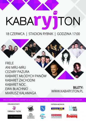 18.06. o godz. 17.00 zapraszamy na największą imprezę kabaretową w regionie. KABAryjTON powraca ze zdwojoną siłą - jeszcze lepszy i jeszcze większy! Salwy śmiechu, doborowe towarzystwo i gwiazdy polskiego kabaretu - nie może Was zabraknąć! Wystąpią: Ani Mru-Mru, Cezary Pazura, Kabaret Młodych Panów, Kabaret Zachodni (Złote Koryta na Rybnickiej Jesieni Kabaretowej RYJEK 2016), Kabaret NOC, Ewa Błachnio, Mariusz Kałamaga oraz gość specjalny: zespół FRELE. Imprezę poprowadzi duet: Ewa Błachnio oraz Mariusz Kałamaga. Stadion Miejski MOSiR, ul. Gliwicka 72, Bilety: 50, 60, 70, 80, 90 zł. KUP BILET