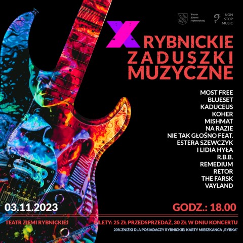 3.11.2023 o godz. 18 zapraszamy na X Rybnickie Zaduszki Muzyczne, doroczny koncert poświęcony Artystom, którzy odeszli do Największej Orkiestry Świata. W dziesiątej edycji wystąpią zespoły: Most Free | Blueset | Kaduceus | Koher | Mishmat | Na Razie | Nie tak Głośno feat. Estera Szewczyk i Lidia Hyła | R.B.B. | Remedium | ReToR | The Farsk | VayLand. Bilety: 25 zł w przedsprzedaży do 2.11.2023 | 30 zł w dniu koncertu KUP BILET | 20% zniżki dla posiadaczy Rybnickiej Karty Mieszkańca „Rybka”