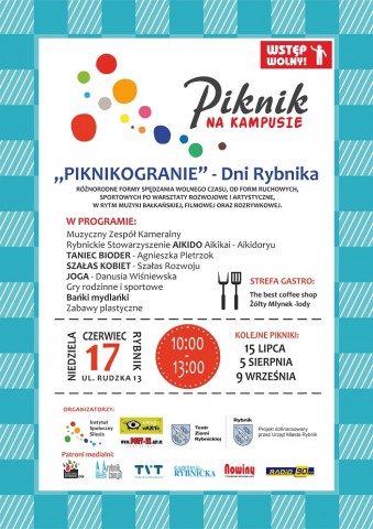 Projekt "Pikniki na Kampusie" realizowany jest przez Stowarzyszenie Instytut Społeczny Silesia oraz Stowarzyszenie Artystyczne Uwagi wARTE przy współpracy z Teatrem Ziemi Rybnickiej i Portem Sztuki, przy ogromnym wsparciu wyjątkowych Wolontariuszy. Projekt dofinansowany przez Urząd Miasta Rybnik. Zapraszamy