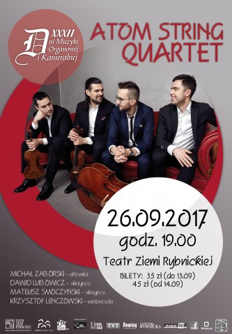 Czterech najsympatyczniejszych rzępajłów z siłą rażenia adekwatną do nazwy zespołu! (Jan Ptaszyn Wróblewski). Atom String Quartet to jeden z najbardziej intrygujących kwartetów smyczkowych na świecie, należący do grona najlepszych wykonawców jazzowych w Polsce. Zespół łączy możliwości kwartetu smyczkowego (czyli dwojga skrzypiec, altówki i wiolonczeli) z szeroko rozumianą improwizacją. Ten najbardziej klasyczny i utrwalony w tradycji muzycznej skład zespołu kameralnego to dla artystów punkt wyjścia do poszukiwań nowych rozwiązań brzmieniowych i formalnych. Trudno w sposób jednoznaczny określić styl muzyczny grupy. W jej twórczości – oprócz jazzu – słychać inspiracje polskim folklorem, muzyką z różnych regionów świata, a także muzyką współczesną i klasyczną. Bilety: 35 zł w przedsprzedaży do 13.09 i 45 zł od 14.09.