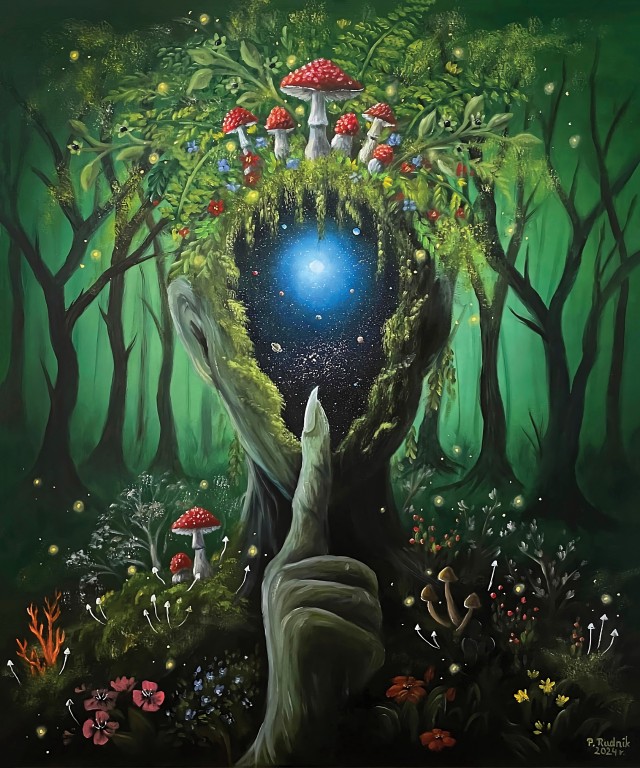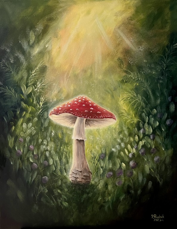 Patrycja Rudnik to artystka i malarka, która od najmłodszych lat wykazywała talent i pasję do rysunku oraz malarstwa. Jej artystyczna podróż nabrała tempa w 2009 roku, gdy otrzymała od cioci – znanej i cenionej malarki – pierwszy zestaw farb olejnych. To właśnie wtedy namalowała swój pierwszy obraz, przedstawiający słoneczniki, a z czasem stworzyła kilkanaście kolejnych dzieł, głównie dla siebie i najbliższych. Pod koniec 2022 roku autorka postanowiła w pełni poświęcić się sztuce, przechodząc na malarstwo zawodowe. Zachęcona przez bliskich, zaczęła publikować swoje prace w mediach społecznościowych, gdzie szybko zyskały one uznanie. Jej styl, pełen lekkości i unikalności, trafia do serc wielu odbiorców. Inspiracje czerpie ze świata baśni, dawnych wierzeń, dzieł takich jak "Wiedźmin", a także z wyobrażeń duchów i postaci ze słowiańskiego bestiariusza. Jej obrazy przepełnione są magią i subtelną nostalgią za dziecięcą wyobraźnią, którą często tracimy w dorosłym życiu. Artystka tworzy zarówno pejzaże, scenki rodzajowe, jak i portrety, z łatwością przenosząc na płótno swoją miłość do natury, lasów, a szczególnie grzybów, zwłaszcza muchomorów (Amanita Muscaria).