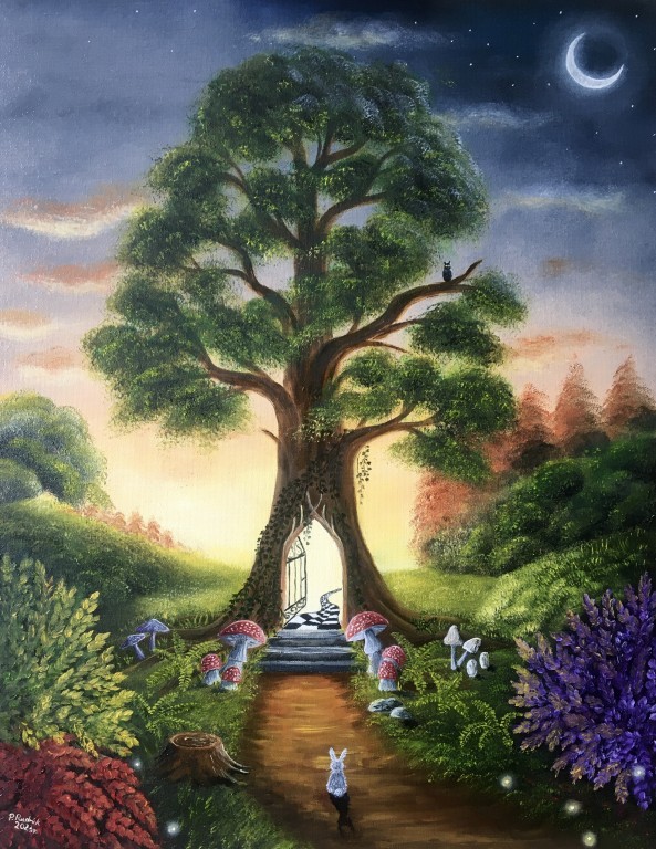 Patrycja Rudnik zaprasza nas swoją sztuką do magicznego świata, który maluje na płótnie – pełnego czarów, natury i wspomnień o baśniach.