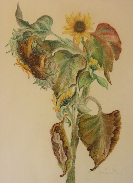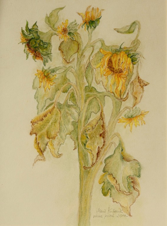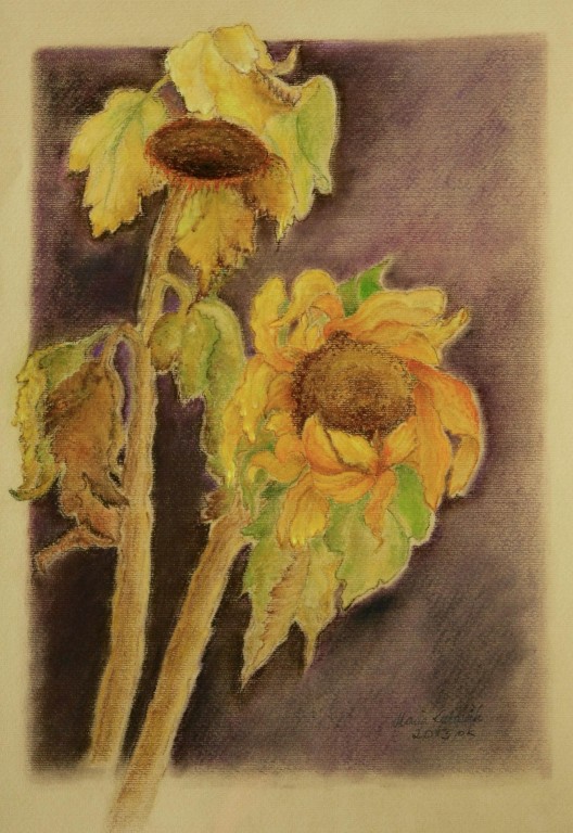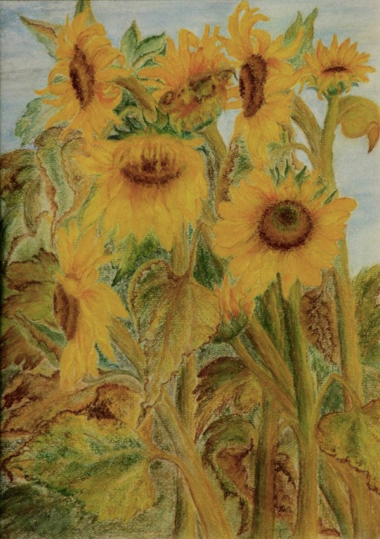 tylko krótkie ich chwile i zwiędną bezpowrotnie. Postanowiłam przedłużyć ich trwanie przynosząc bukiet jako motyw dla artystów do pracowni plastycznej prowadzonej wtedy przez artystę Dariusza Gierdala w Szpitalu Uzdrowiskowym w Ustroniu. Po długiej z Nim, bardzo przekonywującej mnie rozmowie, zdecydowałam się sięgnąć po pastele. I tak zaczęło się moje malowanie. Od tego momentu słoneczniki i pastele towarzyszą mi nieustannie. Od wielkiego uniesienia miłości i radości tamtej jesieni 1995 r., poprzez dramatyczne chwile mojego życia związane z ciężką chorobą mojego męża Andrzeja oraz okres nostalgii i tęsknoty za tym, co minęło, okres odradzającej się radości życia, nadziei związanej z naszym przemijaniem, aż po dzień dzisiejszy.”