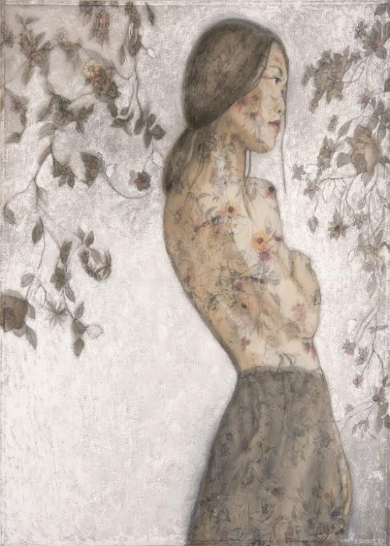 tworzą rodzaj kwiatowego ornamentu. Kobiety mają na sobie linearne znaki niczym fastrygi, przywodzące na myśl operacje plastyczne.