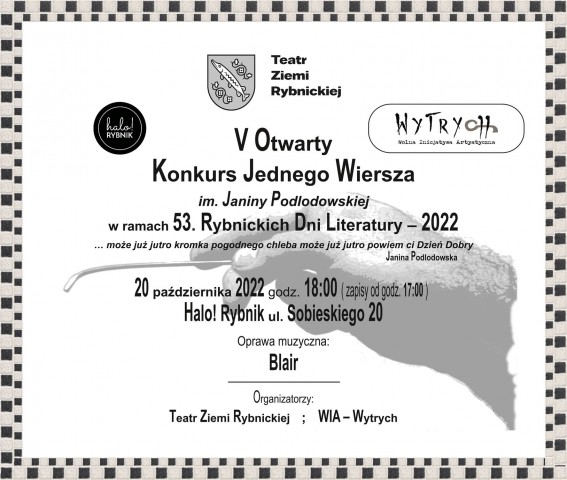 Teatr Ziemi Rybnickiej wraz z Wolną Inicjatywą Artystyczną – Wytrych ma zaszczyt zaprosić w ramach 53. Rybnickich Dni Literatury na V Otwarty Konkurs Jednego Wiersza im. Janiny Podlodowskiej, który odbędzie się: