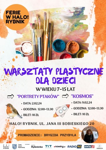 Zapraszamy dzieci w wieku 7-15 lat na warsztaty plastyczne prowadzone przez Brygidę Przybyłę- rybnicką artystkę, malarkę.
