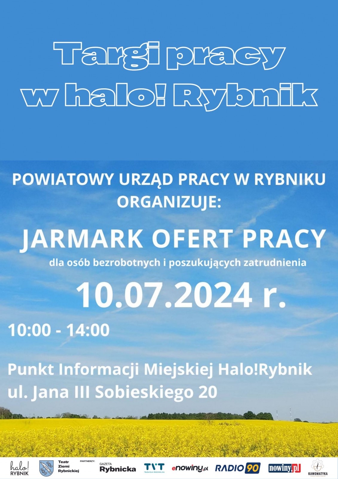 Powiatowy Urząd Pracy w Rybniku zaprasza do udziału w Jarmarku Ofert Pracy dla osób bezrobotnych i poszukujących pracy, który odbędzie 10 lipca 2024 r. w godzinach od 10:00 do 14:00 w Punkcie Informacji Miejskiej Halo Rybnik przy ul. Jana III Sobieskiego 20.