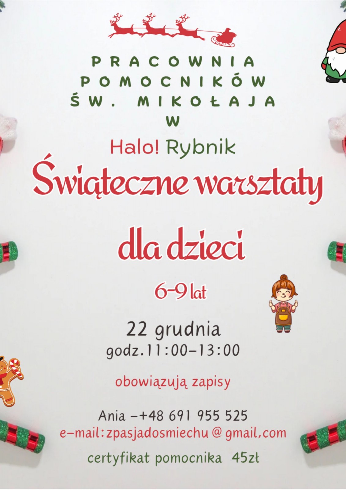 W trakcie warsztatów dzieci przygotują małe upominki dla swoich najbliższych oraz otrzymają certyfikat pomocnika św. Mikołaja!