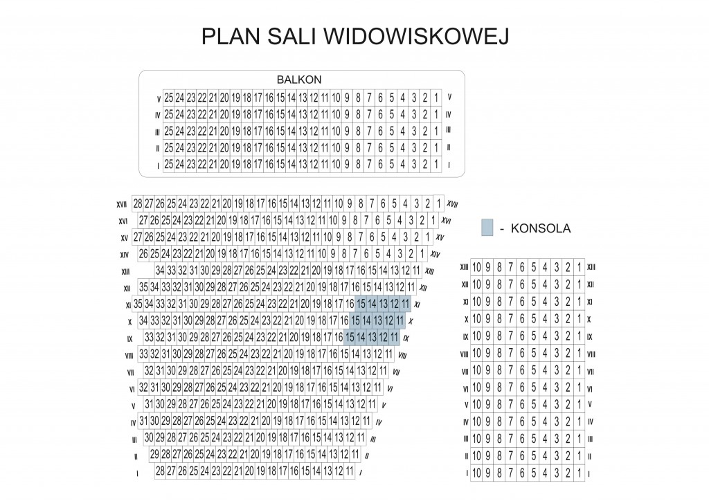 - Sala widowiskowa klimatyzowana o bardzo dobrej akustyce, liczy 650 miejsc (525 parter i 125 balkon).