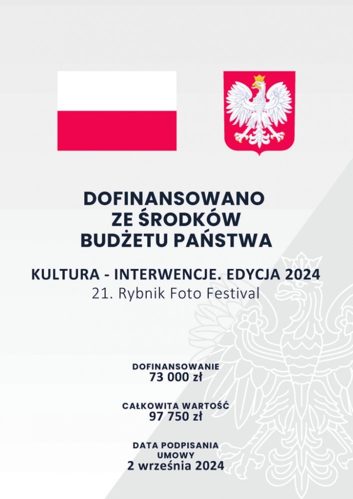 Dotacja: „21. Rybnik Foto Festival” został sfinansowany z budżetu państwa ze środków Ministra Kultury i Dziedzictwa Narodowego w ramach programu Narodowego Centrum Kultury: Kultura – Interwencje. Edycja 2024.
