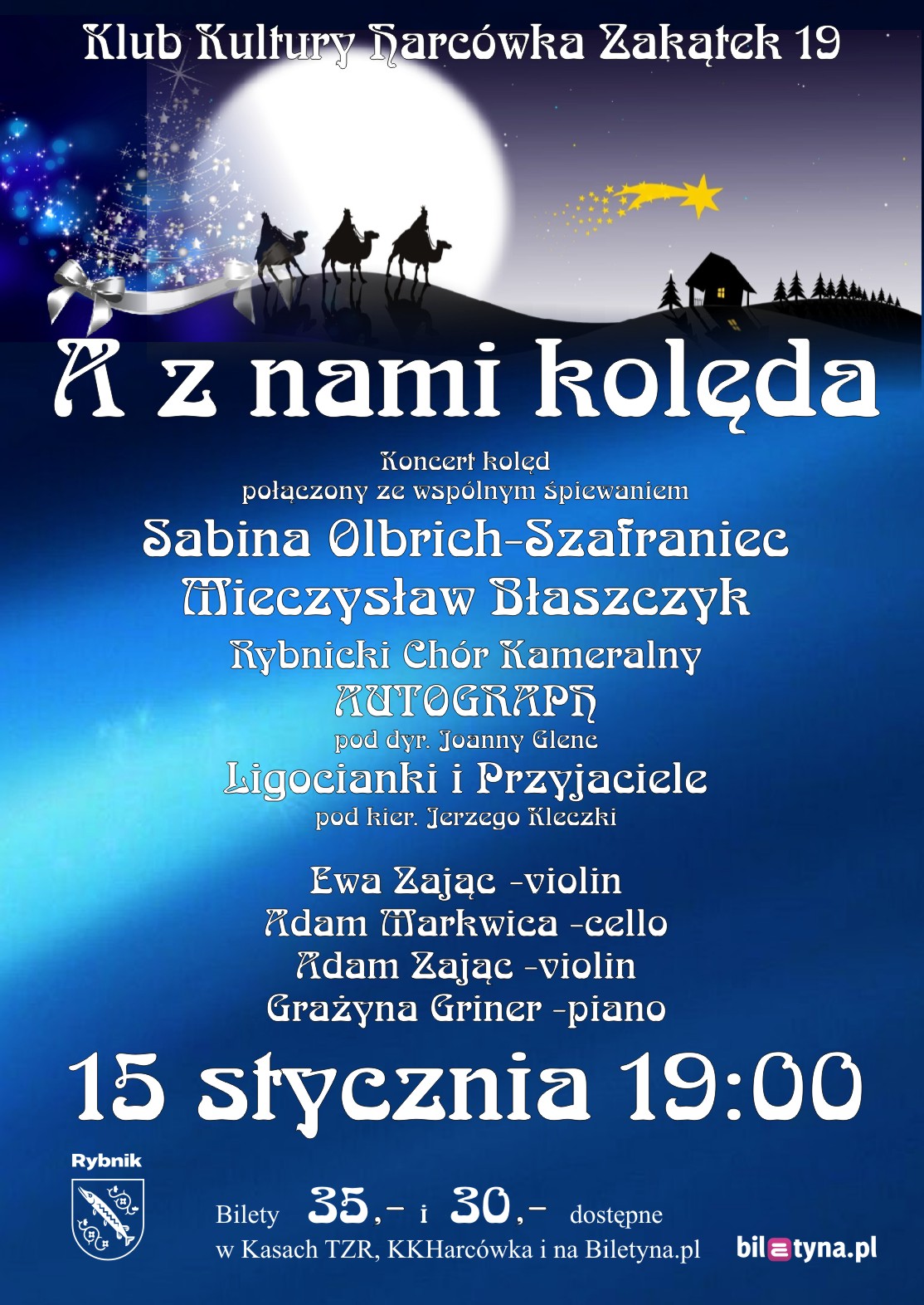 „A z nami kolęda” - biesiadny wieczór ze wspólnym kolędowaniem. Wystąpią: Sabina Olbrich Szafraniec, Mieczysław Błaszczyk z towarzyszeniem Kwartetu instrumentalnego w składzie: Grażyna Griner – fortepian, Adam Zając - skrzypce, Ewa Zając - skrzypce, Adam Markwica – wiolonczela, Rybnicki Chór Kameralny „Autograph” pod kierunkiem Joanny Glenc oraz zespół „Ligocianki i Przyjaciele” pod kierunkiem Jerzego Kleczki.