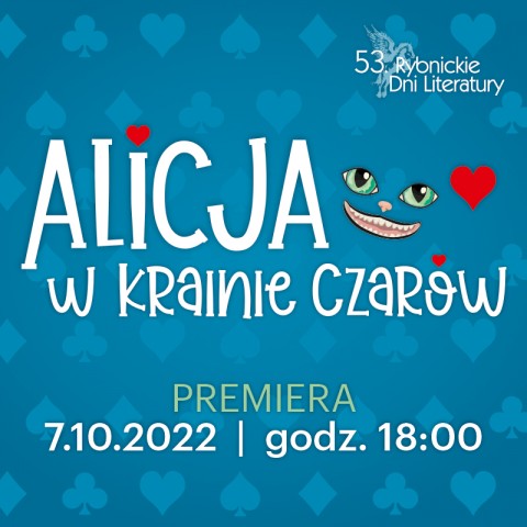 7.10.2022 o godz. 18.00 zapraszamy na premierowy spektakl „Alicja w Krainie Czarów” - w wykonaniu Teatru Lalek Marka Żyły. Po sukcesie „Opowieści wigilijnej” sięgamy kolejny raz po klasykę literatury i popkultury, aby pokazać ją w zupełnie nowym, niespotykanym wymiarze. W dniu inauguracji 53. Rybnickich Dni Literatury zabieramy Was w podróż do niezwykłej Krainy Czarów na spotkanie z jej osobliwymi bohaterami: Alicją, Kapelusznikiem czy Czerwoną Królową. Czas trwania spektaklu: 60 minut. Pokazy dla grup zorganizowanych: 6 i 7 października o godz. 9.00 i 11.00. Zgłoszenia grupowe przyjmujemy pod adresem: organizacjawidowni@tzr.rybnik.pl Bilety: 15 zł ulgowe i 30 zł normalne. KUP BILET