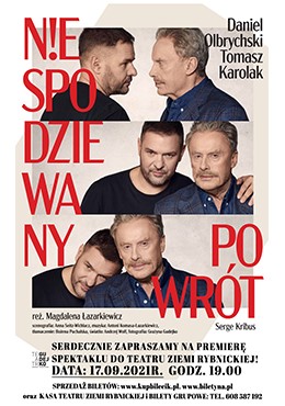 17.09.2021 r. o godz. 19.00 zapraszamy na spektakl komediowy pt. "NIESPODZIEWANY POWRÓT". W rolach głównych: TOMASZ KAROLAK i DANIEL OLBRYCHSKI! Przed nami polska prapremiera sztuki belgijskiego, pracującego w Paryżu aktora, scenarzysty i dramaturga Serge'a Kribusa. „Niespodziewany powrót” to sztuka, za którą autor otrzymał wiele prestiżowych francuskich nagród, a wiadomo, że gdzie jak gdzie, ale w ojczyźnie Moliera na komedii się znają! W „Niespodziewanym powrocie” przeplatają się wątki rodzinne - a czy jest coś bardziej zabawnego niż kłopoty z partnerami, rodzicami i dziećmi, które przydarzają się innym - z rozterkami szekspirowskiego Króla Leara, a te z kolei, z tremą i nadziejami aktora, który tegoż Leara ma zagrać w Teatrze Narodowym. W roli szykującego się do roli króla Leara Daniel Olbrychski. Wie jak się zmierzyć z tym zadaniem, bo Leara grał dwukrotnie. W roli Syna Tomasz Karolak. Jest w tym temacie specjalistą, synem jest od zawsze. Spektakl reżyseruje znakomita reżyserka filmowa i teatralna Magdalena Łazarkiewicz. SPRZEDAŻ BILETÓW: www.biletyna.pl, www.kupbilecik.pl oraz KASA TEATRU tel.32/ 42 22 320 i BILETY GRUPOWE: tel.608 587 192 IMPRESARIAT ARTYSTYCZNY. Cena biletu: od 100 do 130 zł | KUP BILET