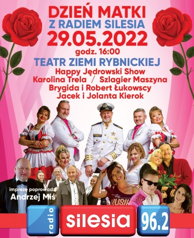 Kocham Cię Mamo… nie wstydźmy się tych słów. Z okazji wyjątkowego święta – Dnia Matki – Radio Silesia zaprasza na niepowtarzalny koncert: DZIEŃ MATKI Z RADIEM SILESIA 29.05.2022 o godzinie 16.00 w Teatrze Ziemi Rybnickiej. Przed nami ponad trzy godziny zabawy pełnej humoru, który zapewni jedyny i niepowtarzalny Andrzej Miś. Ponadto na scenie największe gwiazdy śląskiej sceny muzycznej: Karolina Trela, zwyciężczyni Szlag Listowego hitu roku (autorka przeboju „Tyn fajni chop”) ; legendarna Szlagier Maszyna, która porywa do zabawy od dekad; Jacek i Jolanta Kierok (któż nie zna tych piosenek? „Podaruj mi jedną gwiazdę”, „Sierra Madre”, a zaśpiewają również swoje najnowsze przeboje); Brygida i Robert Łukowscy czyli gwarancja, iż Teatr Ziemi Rybnickiej dosłownie zatańczy oraz - w wyjątkowym godzinnym koncercie Happy Jędrowski Show czyli Mirek Jędrowski oraz przyjaciele z Happy Folk razem na scenie! Wszystko w nowym projekcie muzycznym. UWAGA DO 30.04. SPECJALNA PROMOCJA Bilety w przedsprzedaży: 60 zł miejsca na balkonie oraz 70 zł miejsca na parterze. Od 1.05.2022: 70zł miejsca na balkonie oraz 80 zł miejsca na parterze. KUP BILET