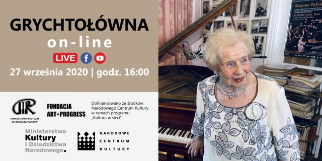 Fundacja Art & Progress oraz Towarzystwo Muzyczne im. Braci Szafranków mają zaszczyt zaprezentować recital nestorki polskiej pianistyki, światowej sławy artystki prof. Lidii Grychtołówny, transmitowany live z jej warszawskiego mieszkania. Na swoim fortepianie Steinway & Sons z 1926 r., Lidia Grychtołówna zagra utwory kompozytorów polskich i rosyjskich. Początek transmisji w niedzielę 27 września o godz. 16:00. Po recitalu - rozmowa Artystki z redaktorem Adamem Rozlachem.