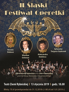 13 stycznia 2019 roku o godz. 18.00 zapraszamy na II Śląski Festiwal Operetki. W koncercie inaugurującym usłyszymy fragmenty operetek: "Carewicz" Franciszka Lehara, "Zemsta Nietoperza" Johanna Straussa, "Błękitna maska" Freda Raymonda oraz kilka pieśni neapolitańskich. W drugiej części koncertu, usłyszymy utwory musicalowe i estradowe, m.in. Alla luce del sole, Music czy Imagine. Wystąpią: Filharmonia Rybnicka oraz Chór Harmonia pod dyr. Sławomira Chrzanowskiego oraz soliści: Renata Dobosz - mezzosopran, Aleksandra Stokłosa - sopran, Sylwester Targosz-Szalonek - tenor. Gospodarzem wieczoru będzie maestro Wiesław Ochman! Bilety: 70 zł w przedsprzedaży do 31.12.| 80 zł od 1.01.2019 r. KUP BILET