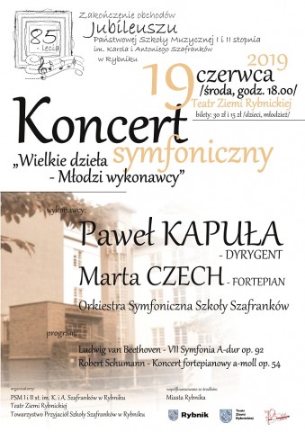 19.06. godz.18.00, "Wielkie dzieła, młodzi wykonawcy" koncert finałowy roku obchodów 85-lecia działalności Szkoły Muzycznej Szafranków w Rybniku. W programie: Ludwig van Beethoven VII Symfonia A-dur op. 92, Robert Schumann, Koncert fortepianowy a-moll op. 54. Wykonawcy: Orkiestra Symfoniczna Szkoły Szafranków pod dyr. Pawła Kapuły, Marta Czech – fortepian. Bilety: 30 zł – dorośli, 15 zł – dzieci i młodzież. KUP BILET