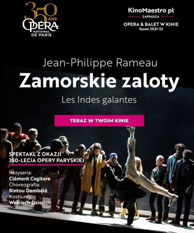 17.05.2022, godz. 18.00. Opera & Balet w Kinie. "Zamorskie Zaloty" z okazji 350-lecia istnienia OPÉRA NATIONAL DE PARIS. „Zamorskie zaloty” Jeana-Philippe’a Rameau wybrano, by uczcić 350-lecie istnienia Opéra national de Paris, jednej z najznamienitszych instytucji kultury Francji. Przygotowana na tę okazję inscenizacja operowo-baletowego arcydzieła francuskiego kompozytora doby baroku odnosi się do dzisiejszych problemów migracyjnych oraz do obecnych europejskich postaw wobec innych ludów czy obcych przybyszów – a wszystko to w zgodzie z treścią libretta. Dzieło Rameau, którego dosłowny tytuł brzmi: „Zalotne Indie” lub „Pełne wdzięku Indie” („Les Indes galantes”), opowiada o niejednoznacznym poglądzie ówczesnych Europejczyków na zamorskie narody, szczególnie w kwestiach miłosnych. Poprzedzone prologiem cztery części „Zamorskich zalotów” noszą podtytuły: „Wielkoduszny Turek”, „Inkowie z Peru”, „Perskie Święto Kwiatów” i „Dzicy”. Każda z nich opowiada egzotyczną historię miłosną, tragiczną lub komiczną. „Zamorskie zaloty” to wielkie barokowe widowisko, pełne śpiewu i tańca, w nowej odsłonie. Ze względu na trudności wykonawcze oraz na swoje rozmiary dzieło to bardzo rzadko pojawia się na afiszach teatrów operowych świata, dlatego paryski spektakl, prezentowany obecnie w kinach, to wyjątkowa gratka dla melomanów. W rolach głównych: Edwin Crossley-Mercer, Julie Fuchs, Stanislas de Barbeyrac, Mathias Vidal, Sabine Devieilhe, Jodie Devos. Reżyseria: Clément Cogitore. Choreografia: Bintou Dembélé. Kostiumy: Wojciech Dziedzic. Dyryguje: Leonardo García Alarcón. Bilety: 24 zł w przedsprzedaży, 29 zł w dniu projekcji. KUP BILET