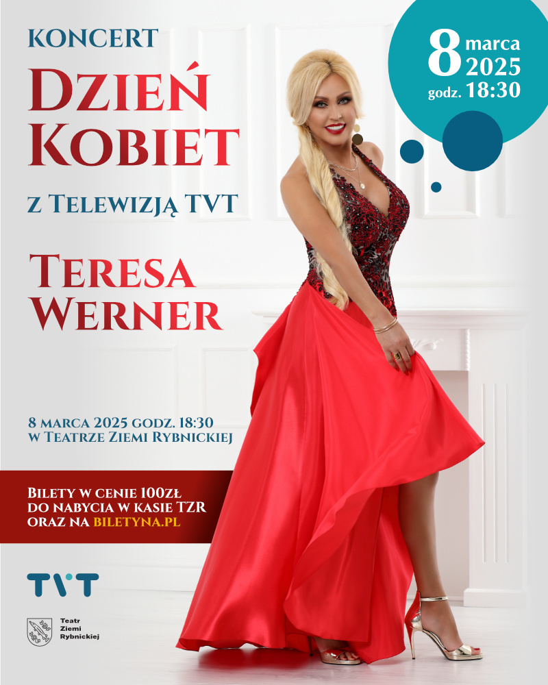 Spotkajmy się 8 Marca i razem świętujmy Dzień Koncert! Specjalnie dla Was na scenie Teatru Ziemi Rybnickiej zaśpiewa niepowtarzalna Teresa Werner.