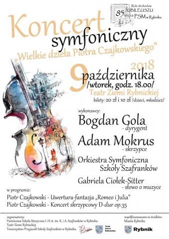 9.10. godz.18.00, zapraszamy na koncert symfoniczny „Wielkie dzieła Piotra Czajkowskiego” w wykonaniu Orkiestry Państwowej Szkoły Muzycznej w Rybniku pod dyr. Bogdana Goli, z okazji jubileuszu pracy pedagogiczno-artystycznej Dyrektora PSM w Rybniku. W programie: Uwertura-Fantazja "Romeo I Julia" b-moll i Koncert Skrzypcowy D-Dur Op.35. Adam Mokrus – skrzypce. Organizatorzy: PSM I i II stopnia w Rybniku, Teatr Ziemi Rybnickiej, Towarzystwo Przyjaciół Szkoły Szafranków w Rybniku. Bilety: 25 zł normalne, 15 zł dzieci i młodzież. KUP BILET